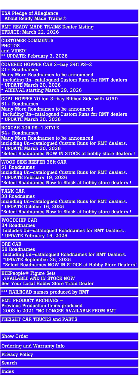 All product color photos, product artworks and product descriptive text are reserved to RMT - Ready Made Trains and may not be copied or used otherwise without specific written permission. The words 'RMT','READY MADE TOYS', READY MADE TRAINS', 'Train-Master". 'BEEP', 'BUDDY', 'BEEF', 'PEEP','BEEPeople', 'BANG', 'ZIP'and 'BOPPER' as used to describe any products listed herein, are descriptives of and to the RMT brand products offered at RMT - READY MADE TRAINS.