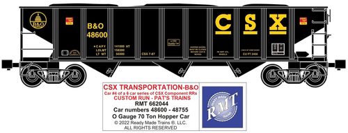 CSX 3-bay ribbed side coal hopper sublettered for B&O component trackage. Car #4 of a 6 car CSX coal hopper car series...each car available separately. Special Custom Run/Limited Edition for Pat's Trains in Wheeling, WV.